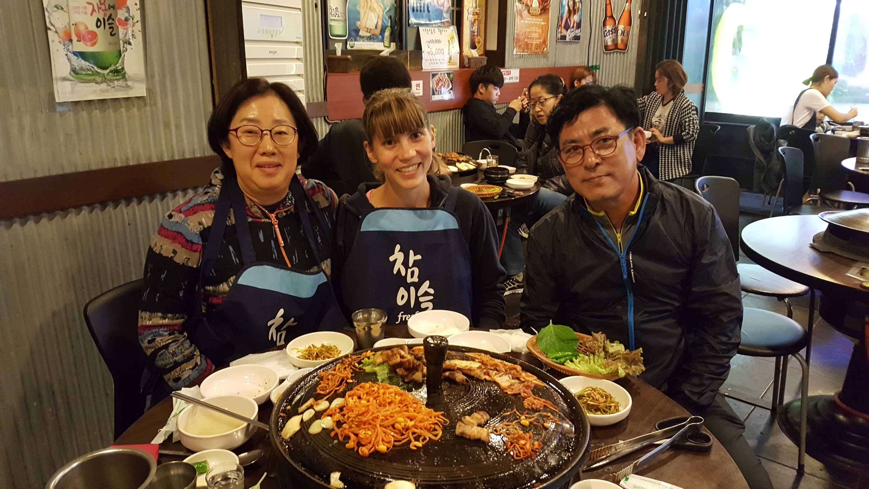 De är jättesnälla och bjöd på restaurang ikväll. Chang får jag inte träffa förrän imorgon. Vi åt grillat kött med pinnar. Mamman hade en app eller liknande på telefonen som översatte hennes koreanska till engelska. Så där satt vi och pratade med en telefon. Blev bara lite konstigt när hon frågade vilken stad jag kommer ifrån och jag svarade ”ingen, jag kommer från landet”. Nästa fråga löd: Men jag trodde du kom från Sverige…